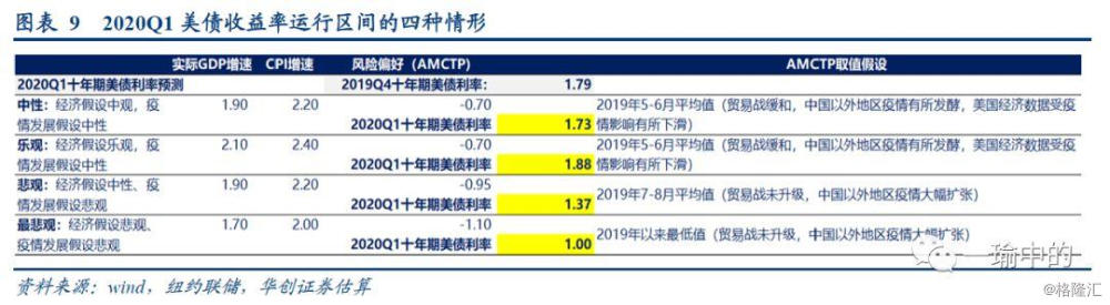 从基本面定价模型看,有破1%的可能。我们可以做一个大概的情形预判,以美债三因素模型(GDP增速替代实际利率、CPI替代通胀预期、AMCTP替代风险偏好)为分析框架,我们假设了乐观、中性、悲观、最悲观四种情形,测算了2020Q1可能的美债收益率运行区间。可以看到若疫情继续发酵,美国一季度GDP增速掉至1.7%-1.9%,CPI在2.0-2.2%,风险偏好没有进一步恶化维持现在位置,那么美债收益率的基本面定价中枢应当在1%-1.4%区间,如果考虑经济冲击和风险偏好进一步恶化,存在破1%的可能性。