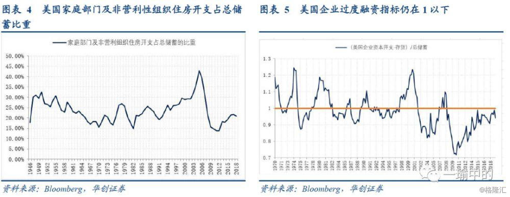 对于企业而言,虽然整体杠杆水平高于2008年,但并未出现过度融资的极端化。当美国企业资本开支减去存货来衡量的增量投资与总储蓄的比值大于1的时候,意味着企业部门的新增投资超过了经济体的总储蓄,这个数值越高就意味着其过度融资(无论股权还是债权),如果该比值小于1,意味着企业部门的融资大体在总储蓄的范围之内。可以看到2000年和2008年爆发大风险的时候,企业都呈现出了明显的过度融资的极端化,而目前该指标仍在1以内,这与这些年居民部门降杠杆增加储蓄的背景是一致的。