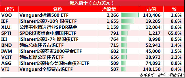在这样的市场环境下,又有哪些ETF能够坚挺的继续吸收资金呢?除了市值大的VOO,位居第一的是避险老江湖,美国7到10年期国债基金IEF,净流入16.5亿美元。BND、AGG这样的债券领域的宽基基金也有数额不等的资金流入。