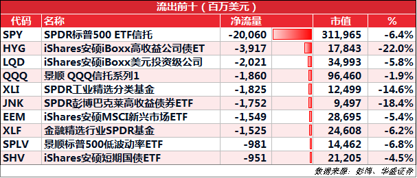 在领衔净流出的ETF里,几乎无悬念的是,老大哥SPY首当其冲,多达200亿美元资金流出这只ETF,占到了其资产规模的6.4%,想必道富资管也感到肉疼。科技股代表挂钩纳斯达克100指数的QQQ也有18.6亿美元流出,从其资产规模来看折损1.9%倒是影响不大。