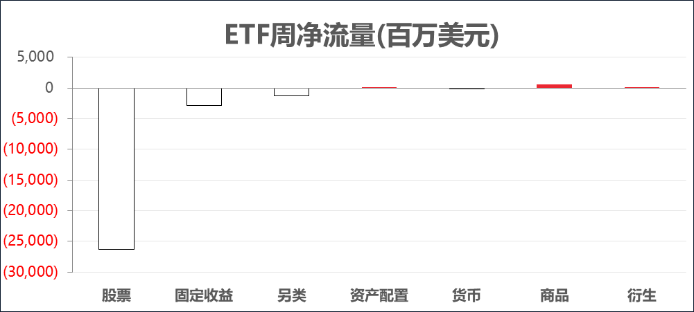 上周全球市场经历血腥一周,股债齐现资金出逃状况,商品类ETF出现轻微净流入。