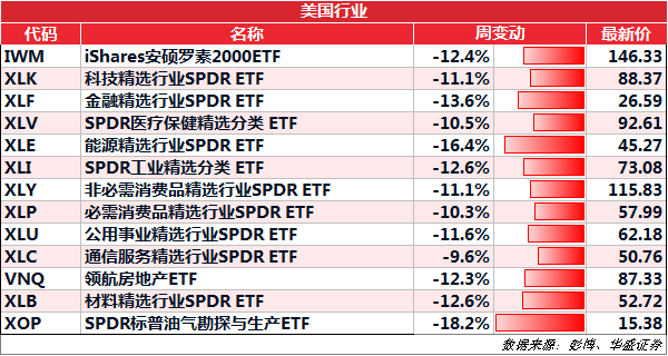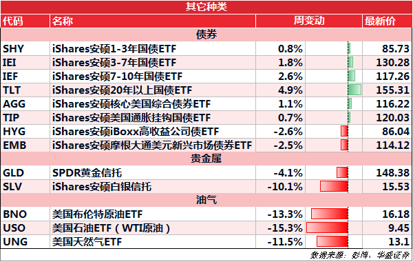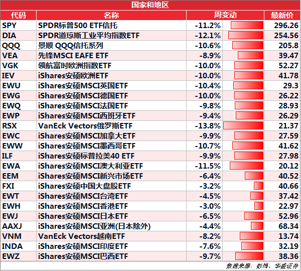 上周几乎全球市场都呈现下挫状态,尤其是美国、欧洲、俄罗斯,相关市场的ETF下跌超过10%。