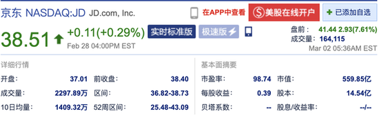 新浪科技讯 3月2日下午消息,京东(Nasdaq:JD)今日发布2019年第四季度未经审计财报。财报显示,京东第四季度营收为1707亿元,市场预期为1669.58亿元。受此利好消息,截止北京时间18:38,京东盘前涨7.61%,报41.44美元。