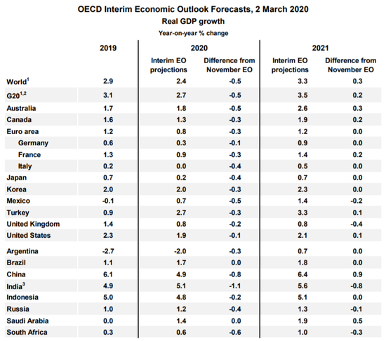 周一(3月2日),经合组织发布最新全球经济增速预期。警告本季度全球经济可能陷入萎缩,将2020年全球经济增速预期从2.9%下调至2.4%。