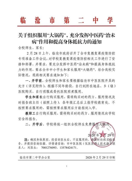 今天看到的另外一则荒谬的消息是,云南临沧市教育体育局,居然强制师生服用“大锅药”来防范疫情。据说具体药方由临沧市中医医院开具,助力疫情防控。截至2月21日,该院已多次向市民持续免费发放“大锅药”。一个国家不怕事大,就怕愚昧的人多,更怕愚昧的人还掌握着公权力,还以对你好的名义来要你的命。中药再好,也应该一方一人吧,让几万人喝同一种中药,而且不分老小,连3-8岁的孩子也要一起喝。这到底是药呢,还是符咒汤啊?是救人命呢,还是要人命啊?幸亏网友及时起哄,当地政府出面制止,否则还不知道会喝出什么幺蛾子呢。