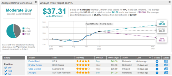 沃尔夫研究公司(Wolfe Research)分析师弗莱什曼(Steve Fleishman)给PPL设定了41美元的目标价,这意味着该股有36%的上涨潜力。为了支持他的买方评论,弗莱什曼写道:“到2024年,PPL的增长率预计将达到4%……我们相信投资者会看好PPL的长期投资机会。同时,PPL的收益率在美国公用事业公司中遥遥领先。”