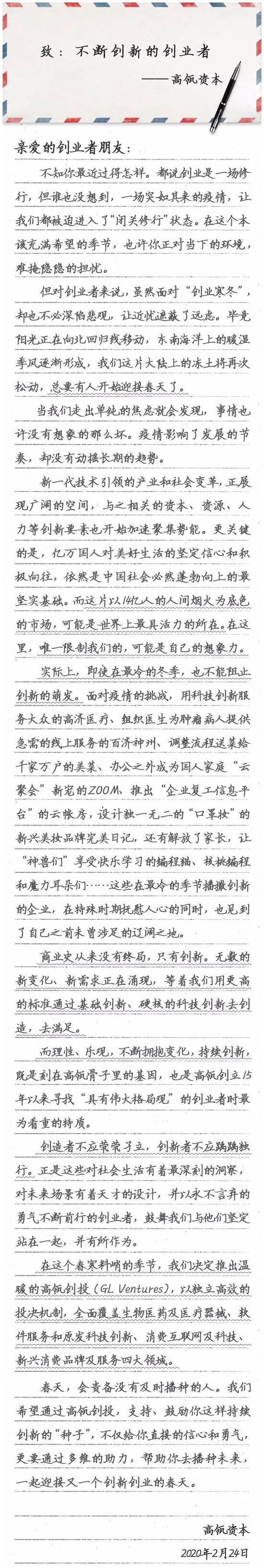 “越是逆境之中,中国的商业创新力量,越是需要通过创新资本,以更加灵活的机制,更市场化的运作方式。我们希望,在未来的中国,有更多伟大的创业者在科技、人文、效率、创新的资源组合中,创造更大的价值,并且回归创造价值的初心,为人们创造更美好更幸福的生活。”