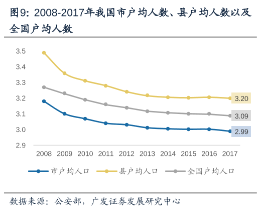 但是,与这一趋势同步的是,我国家庭也越来越小了,户均人数在 2017 年下降至 3.1 人,未来有望继续减小,可以部分抵消少子化带来的负面影响。