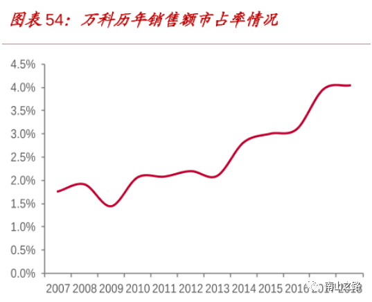 具体到万科,其销售额市占率也是一路提升,从十年前的不到 2%,提高到 2018 年的 4.05%,2017 年为 3.96%。未来 5 年内,万科是否能进一步提高市占率?南山认为这个答案是非常肯定的,因为万科有足够的资金储备。