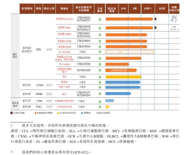 公司的特色产品为处于临床阶段及涵盖了-主要癌症适应症的三种高分化型或新型候选药物,包括奥布替尼(BTK抑制剂)、ICP-192(泛FGFR抑制剂)及ICP-105(FGFR4抑制剂)。