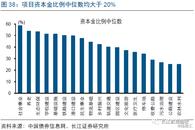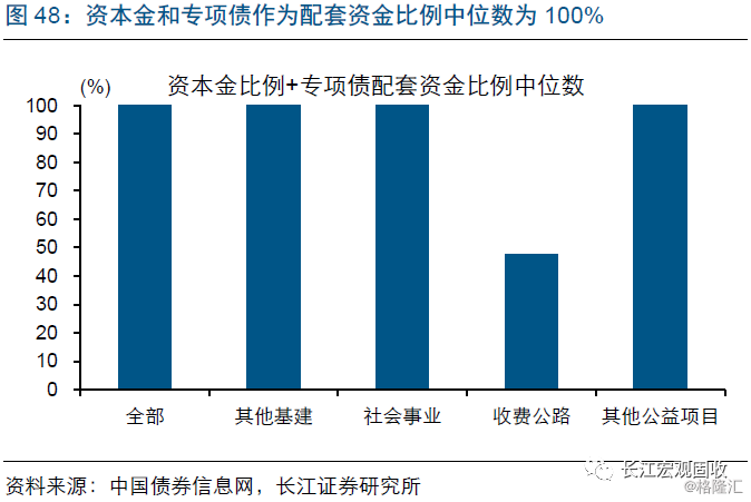 现金流偏弱的情况下,项目资本金比例较高,平均水平在40%左右。 我们统计样本中,项目资本金比例中位数为40%,资本金比例高于平均水平的项目占比达52%,超过50%的项目占比达42%,比例低于20%的非常少、占比只有9%。 分项目类型来看,收费公路由于有较为稳定的现金流,项目资本金比例相对较低、中位数为29%,其他基建项目资本金比例高于全样本、中位数为47%,社会事业资本金比例也超过40%。 与项目资本金比例最低要求相比,专项债支持项目的资本金比例,大多远高于下限。