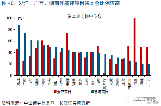分地区来看,中西部地区基建项目资本金比例相对较低,但广西、湖南等基建项目资本金比例较高。上述样本中,中部项目资本金比例中位数最高、达46%,西部地区最低、为34%;如果只考察基建项目,中、西部资本金比例相对较低,中位数分别为35%和36%,东部相对较高、达48%。具体省市来看,除浙江、山东、青岛、辽宁外,基建项目资本金比例中位数排名前十的均为中西部地区,包括广西、湖南、河南、四川等。
