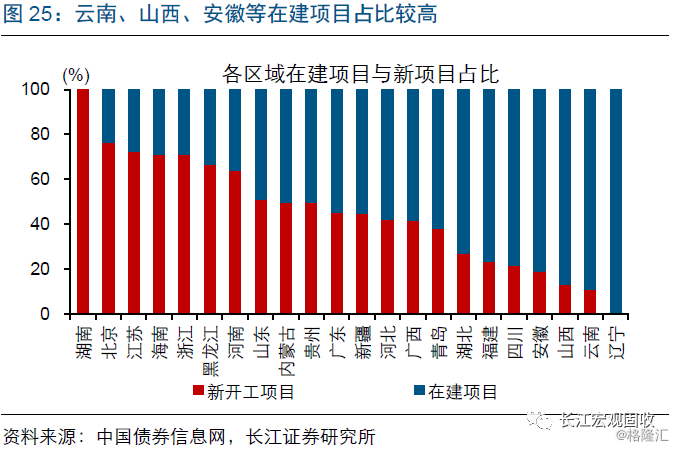 年初以来,专项债支持的项目以在建项目居多,新开工项目占比四成。据不完全统计[3],专项债支持的项目中,新开工项目和在建项目占比分别为40%和60%,新开工项目占比与前文提到的河北、河南重大项目中新开工比例基本一致[4]。分地区来看,中部地区在建项目占比较高、达71%,东部地区新开工项目占比超过全国平均水平;其中,云南、山西和安徽等中西部省在建项目占比超过80%,湖南暂时全部为新开工项目,北京和海南新开工项目占比超过70%。