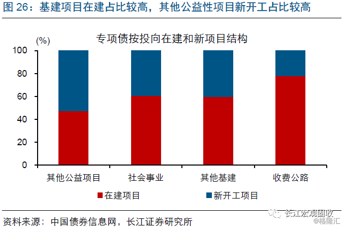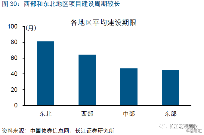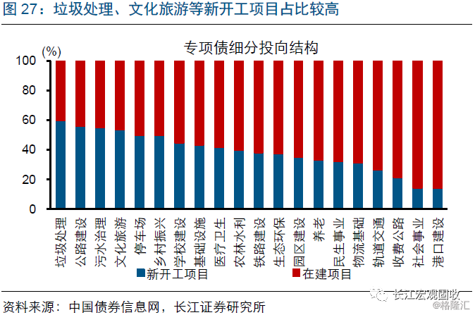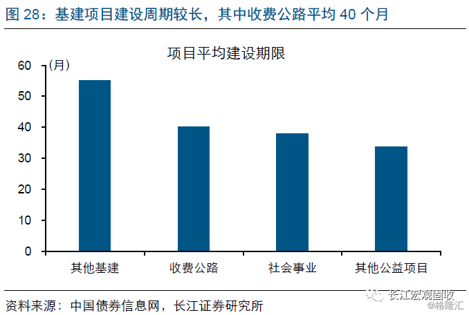 (4)专项债项目以在建居多,新开工项目占四成;建设周期较长的基建项目,需专项债持续支持。据不完全统计,年初专项债支持的项目,新开工和在建项目占比分别为40%和60%。其中,基建项目在建比例较高,垃圾处理等新开工项目相对较多;基建项目建设周期平均达53个月,垃圾处理等平均在20个月内。
