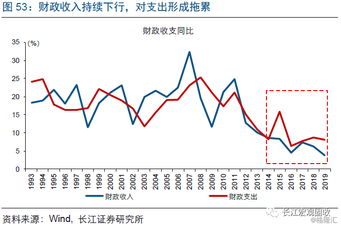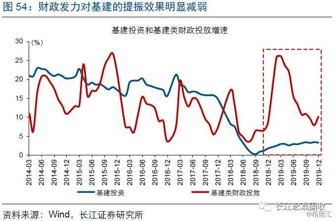 高杠杆背景下,专项债等广义财政稳增长资金的利用效率下降,空间也受到掣肘。经过前几轮稳增长,地方杠杆持续抬升,债务压力上升,城投平台融资以借新还旧为主,部分制约了地方稳增长的能力。高杠杆压制下,财政发力对基建提振效果明显减弱;例如,2019年基建类财政投放大幅增长,但基建投资改善有限。随着经济增速回落、大规模减税降费等影响显现,财政收入增速总体回落,收支平衡压力加大,掣肘支出空间。