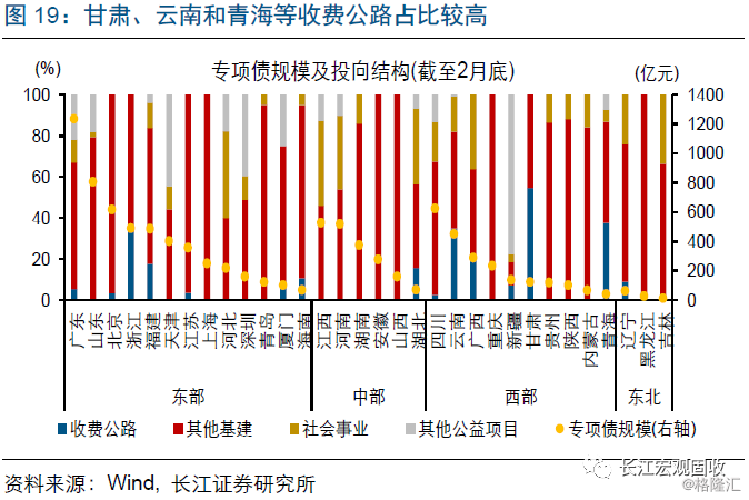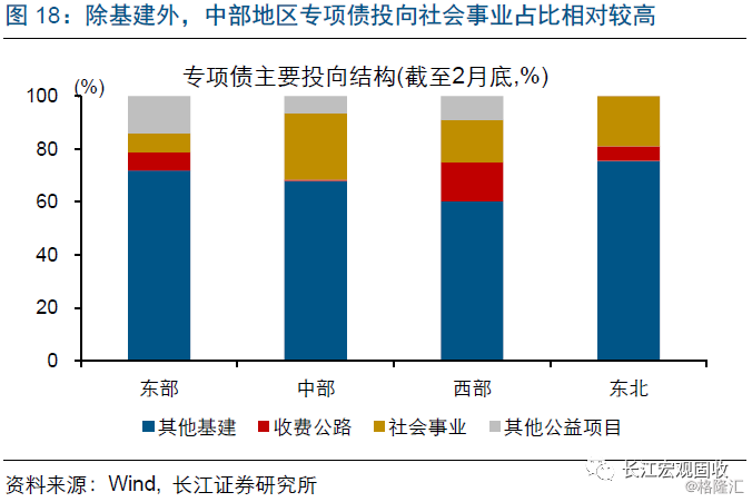 (3)今年专项债投向基建比例大幅提升,其余多投向民生相关项目。截至2月底,专项债投向基建占比达76%,高于去年的25%,其中交通运输相关占比较高、至少有26%;非基建项目中,社会事业、生态环保等占比不低、合计达21%,其中东部对生态环保投入较大,中西部、东北对社会事业相关投入相对较高。