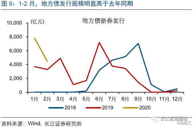 年初以来,地方债发行较快,可为政府主导的项目提供一定资金支持。今年1月份,地方债新券发行7851亿元,远高于去年同期的3688亿元;疫情对投资节奏的干扰,或使得这部分募资多延后到复工开始使用。节后地方债依然保持较快发行,2月地方债发行规模达4421亿元,也明显高于去年同期。分债券类型来看,截至2月底,专项债已经发行了提前下达额度的74%,一般债已经发行了提前下达额度的49%。