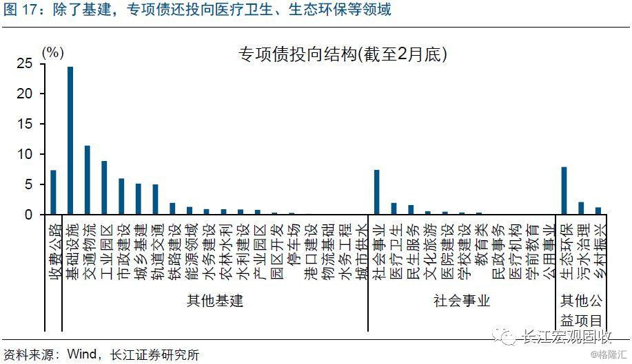 今年专项债投向基建比例大幅提升,其余多投向民生相关项目。截至2月底,专项债投向基建占比达76%,高于去年的25%,其中交通运输相关占比较高、至少有26%;非基建项目中,社会事业、生态环保等占比不低、合计达21%,其中东部对生态环保投入较大,中西部、东北对社会事业相关投入相对较高。