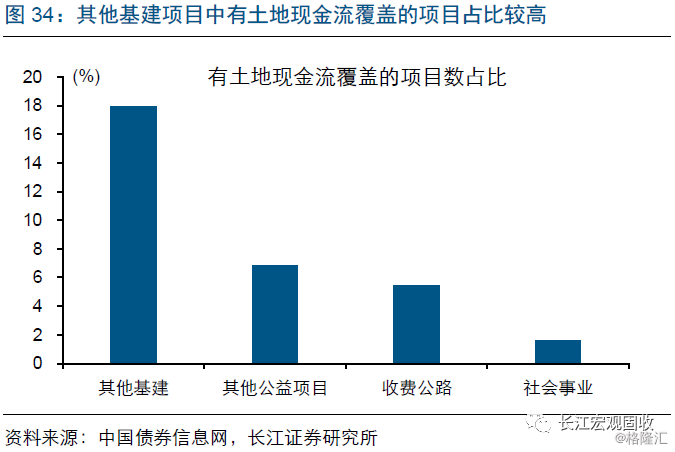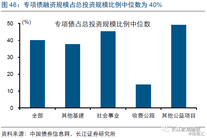 现金流约束下,不仅资本金比例高,项目融资对专项债的依赖也较高。我们统计的样本中,专项债融资占所支持项目总投资规模的比例,样本中位数为40%,其中比例超过50%的占比达36%,比例超过70%的占比有22%。分项目类型来看,收费公路项目专项债融资比例较低、中位数为14%,其他公益性项目专项债融资比例最高、达49%,社会事业项目专项债比例也相对较高,其他基建与全部平均水平基本相当。