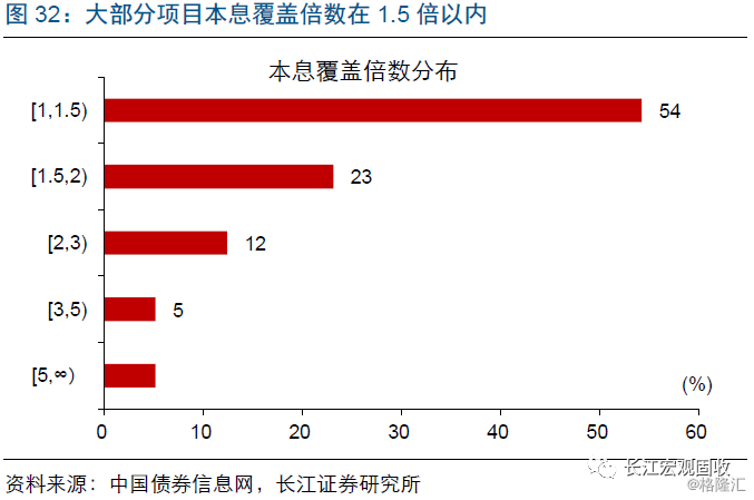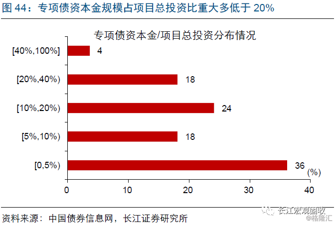 (5)现金流偏弱下,项目资本金比例远高于最低要求、平均在40%左右。我们统计的样本,项目本息覆盖倍数大多在1.5倍以内,其中基建项目中位数为1.4倍。偏弱的项目现金流,使得项目资本金比例较高,样本中位数为40%、低于20%的只有9%。此外,专项债做资本金规模明显增加,但占资本金比例总体不高。