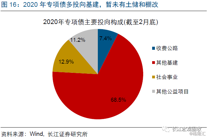 专项债投向基建比例大幅提升,暂未投向土储和棚改。截至2月底,今年已发行专项债投向收费公路和其他基建占比合计达76%,高于2019年的25%。由于2019年9月4日国常会已明确指出,“专项债资金不得用于土地储备和房地产相关领域”,限制了土地储备专项债发行,而棚改专项债也暂未有发行计划,使得基建占比大幅抬升,而2019年土储和棚改专项债占比合计达67%(详细分析参见《专项债,最“新”动向》)。