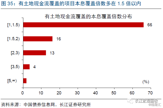 据不完全统计,大部分项目本息覆盖倍数在1.5倍以内,部分基建项目对土地现金流依赖较高。在我们统计的样本中[5],项目本息覆盖倍数大多在1.5倍以内、占比达54%,超过2倍的比例只有23%。大类投向来看,社会事业本息覆盖倍数相对较高,样本中位数为1.5倍,收费公路和其他基建项目样本中位数均为1.4倍。部分项目有土地现金流覆盖,其中其他项目有土地现金流覆盖项目占比达18%;有土地现金流覆盖的项目现金流相对更弱,本息覆盖倍数在1.5倍以内的占比达66%。