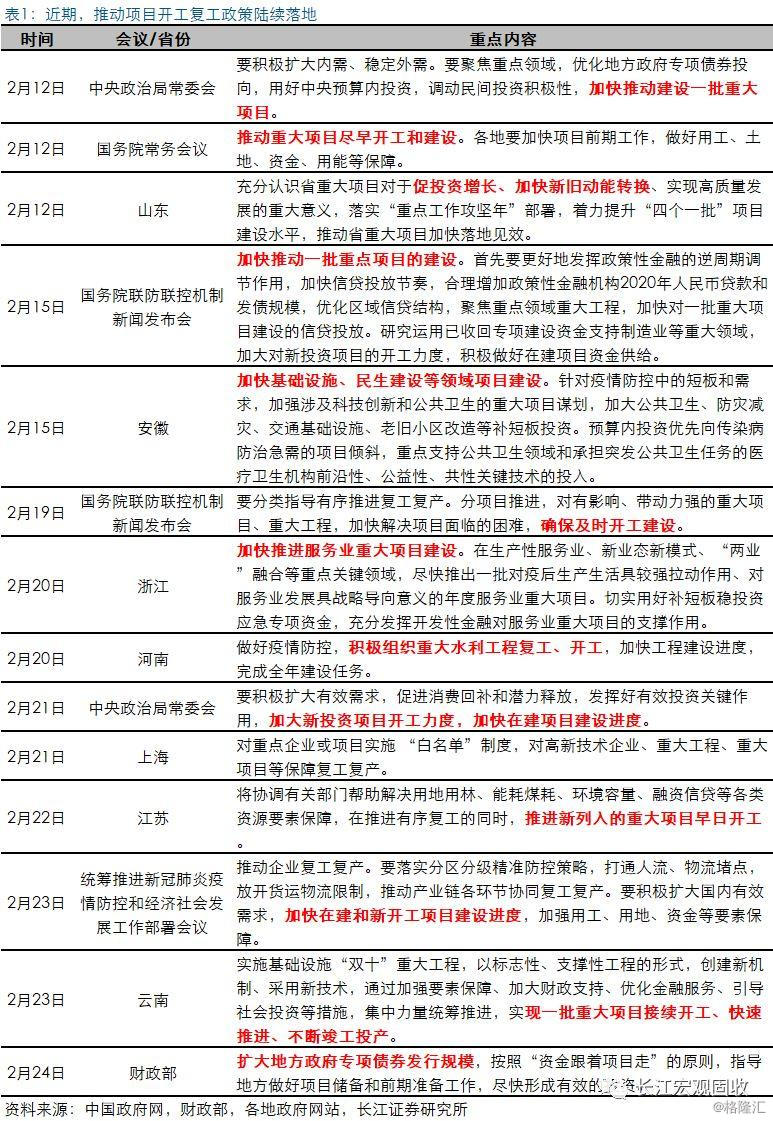 近期,加快推动一批重大项目建设的措施陆续落地。2月3日,中央政治局常委会强调,疫情较轻的地区,要在做好防控工作的同时,积极推动企业复产复工,推动重大项目开工建设。随着防控疫情效果逐步显现,推动项目开工、复工措施明显增多。2月12日,中央政治局常委会、国务院常委会均强调,要加快推动建设一批重点项目。浙江、河南、上海、云南等地,先后公布今年重点项目计划,项目开工和建设进度或趋于加快。