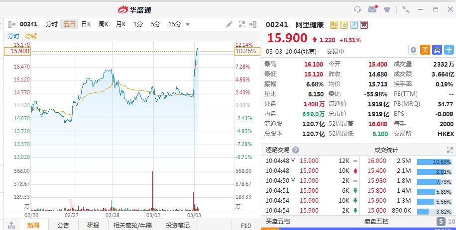格隆汇3月3日丨阿里健康(0241.HK)现涨8.31%,报15.90港元,暂成交3.664亿港元,最新总市值1919亿港元。花旗研报指,阿里健康能够借助支付宝在电子支付上的优势,快速寻求省级政府的合作,成为“互联网+”医保服务的受益者,上调目标价43%至20港元。