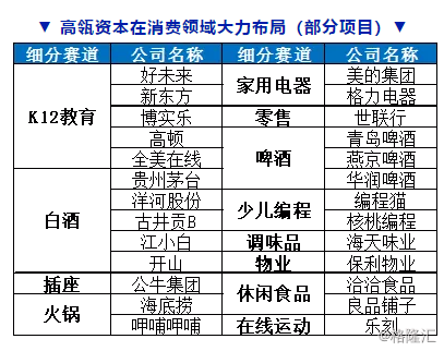 一件件投资案例可以看出:高瓴资本极其重视消费行业的投资,敢于重金下注,且被投的领域遍布消费品到消费服务的各类细分领域(eg:教育、白酒、插座、火锅、休闲零食、家电等)。