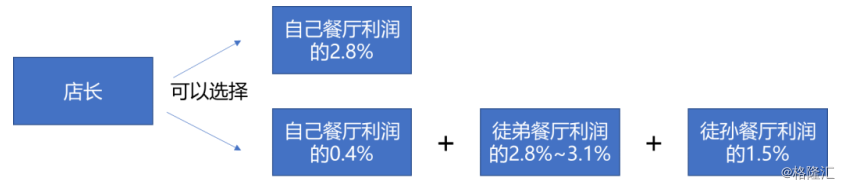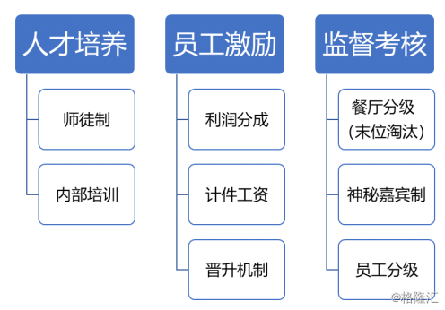 人员培养:以“师徒制+内部培训”为主,每个员工在加入时将配置一位师傅,师傅会定期指导和支持徒弟,师傅可以分享徒弟未来管理门店的利益,即收入可以是“自己餐厅利润的0.4%+徒弟餐厅利润的2.8%-3.1%+徒孙餐厅利润的1.5%”。这样的机制有利于利益捆绑和分享,打破了连锁企业门店之间的竞争模式,扩大管理半径,实现区域化运营。