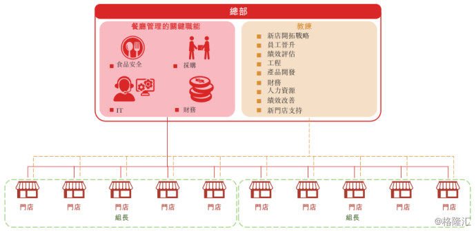 海底捞的组织架构经过时间演变,现在发展为“总部-教练-抱团小组-门店”。整个架构以扁平化管理为基础,与其他连锁门店层级较多、管理人员过多的臃肿架构形成差异,用简单的架构缩短中间管理链条,保证企业能够快速扩张门店。