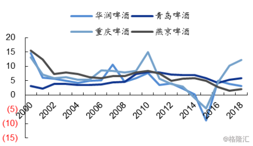 第四阶段:2015年至今,寡头企业难以通过降价、扩产能获得更多市场份额,于是停止价格战和扩产能,逐渐在区域建立自身竞争优势,优化产能、冲击高端啤酒市场,净利润起底回升,龙头股价值凸显。