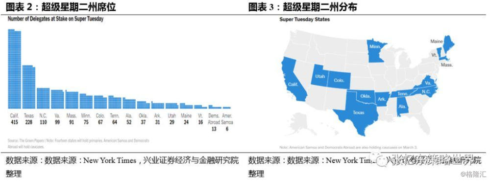 1、重要性:历史规律,“超级星期二”的胜者往往大概率赢得两党党内的总统候选人提名。根据规则,在2020年7月民主党全国代表大会第一轮表决时,从3979 “承诺代表”席位中过半数(即1991个)的民主党竞选人便能直接提名候选人,而美东时间3月3日“超级星期二”将产生1344个席位(约1/3)。