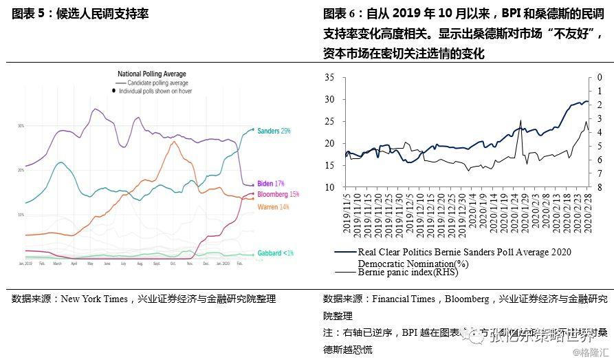 4、“超级星期二”选举结果短期将扰动美国资本市场,甚至中期影响美股牛熊。首先,过去三届“超级星期二”当日,标普500指数均出现较大涨跌,分别为:2018/2/5(-3.2%),2012/3/6(-1.54%)和2016/3/1(+2.39%)。其次,根据金融时报对“伯尼桑德斯恐慌指数”(Bernie Panic Index,简称BPI)的构建,我们使用对桑德斯政策最敏感的行业股价指数(医疗(权重33%)、金融(33%)、能源(17%)、信息技术(17%)相对标普500的超额收益,计算加权平均复制BPI。发现自从2019年10月以来,BPI和桑德斯的民调支持率变化高度相关。显示出桑德斯对市场“不友好”,资本市场在密切关注选情变化。