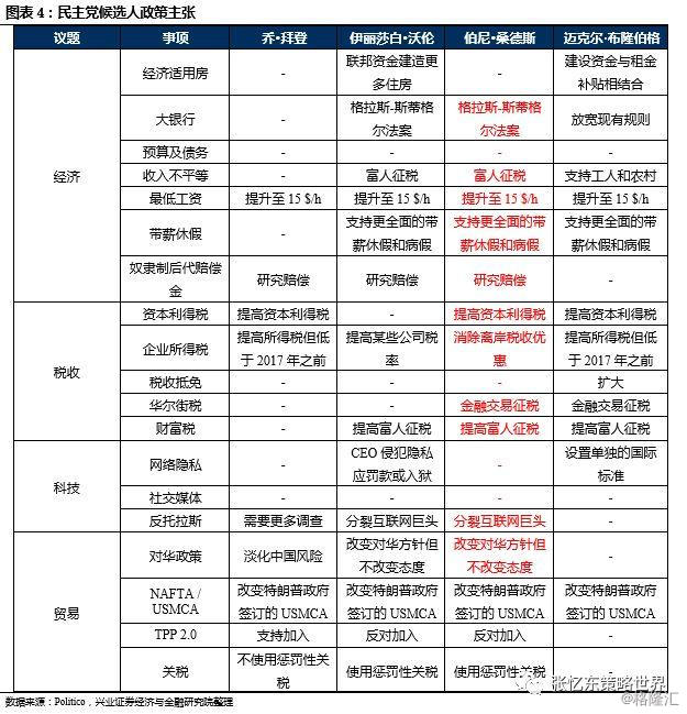 温和派:乔·拜登,其在反托拉斯议题上认为“需要更多调查”,富人征税问题未明显表态,主张淡化“中国威胁”。