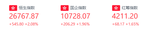 恒指周四(3月5日)大幅上涨,早盘高开高走,全日单边上涨。午后维持震荡。截至收盘,恒指涨2.08%,报26767.9点,为一个月以来最大单日涨幅,成交金额1326.3亿港元。国企指数涨1.96%,报10728.07点,红筹指数涨1.65%,报4211.2点。