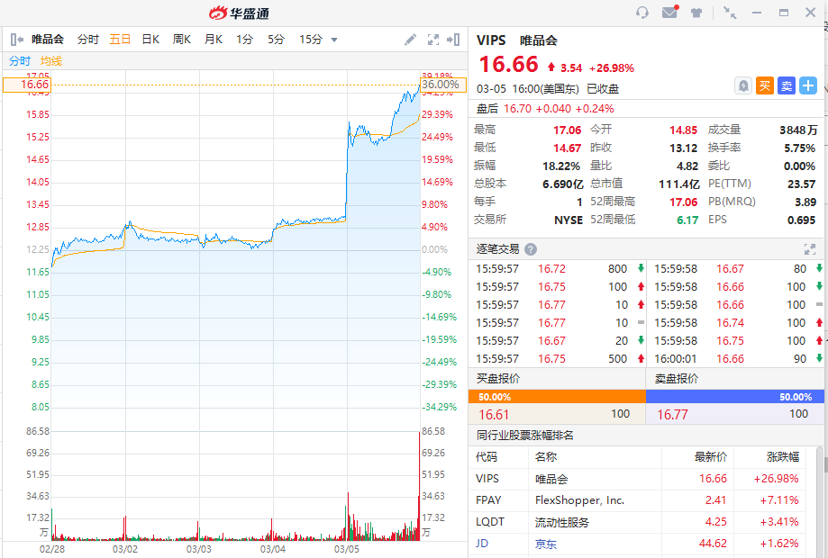 唯品会第四季度净利润同比增长111.4% 股价大涨26.98%