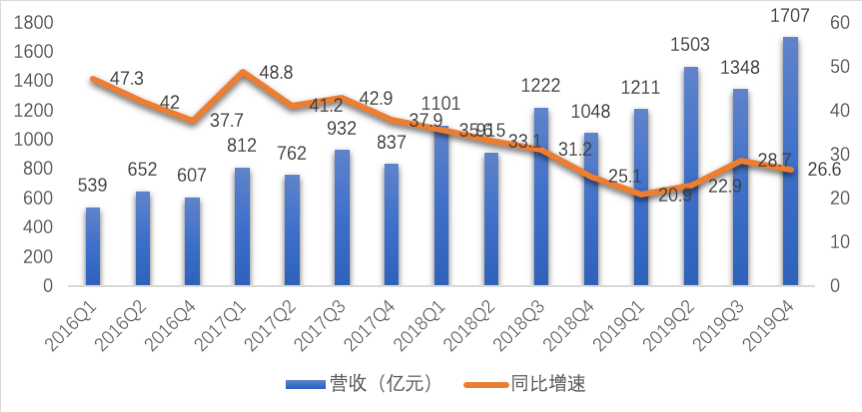 2019全年,京东营收为5769亿元,同比增长24.9%;Q4,京东营收达到1707亿元,同比增长26.6%,超出此前公司指引1630-1680的区间上限,而且也超出市场一致预期的1670亿元。