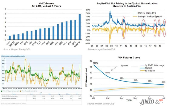 第一,众多指数的隐含波动率较前5年增加5个标准差。第二,由于高位修正,标普500指数隐含波动率相关性已经升自2018年2月以来最高位。第三,隐含波动率变化符合最近交易量异常飙升的情况。