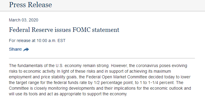 声明中称,美国经济基本面依然强劲。然而冠状病毒给经济活动带来了持续风险。为了支持实现其最大限度的就业和价格稳定目标,联邦公开市场委员会FOMC决定将联邦基金利率的目标区间下调1/2个百分点,至1-1.25%。委员会正在密切监测事态发展及其对经济前景的影响,采取适当行动支持经济。