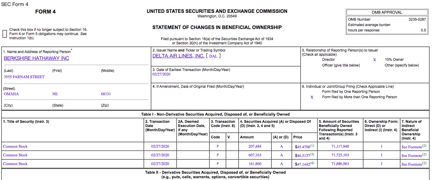 根据伯克希尔·哈撒韦此前发布的2019年的财报显示,其前十大重仓股中,达美航空位居第九位。截至2019年末,伯克希尔持有7091万股达美航空股票,占公司持股百分比为11%。