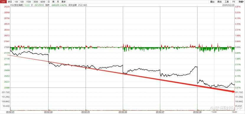 这也就是这次市场走势神奇的地方,国内防疫都打了一个多月了,全球市场还是很平稳,疫情在发达国家扩散之后,立刻暴跌...说啥好呢...港股作为离岸市场,受全球市场情绪影响极大,所以上周,恒指也跟着外盘一通大跌...