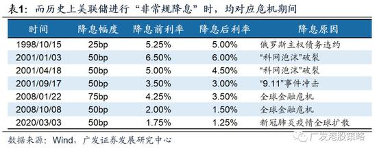 但降息时间点与方式超预期。市场未预料到美联储会在短时间内做出迅速反映;另一方面,本次降息也是2008年之后,美联储首次在非议息会议时间宣布降息,而历史上美联储进行“非常规降息”均对应危机爆发期间。