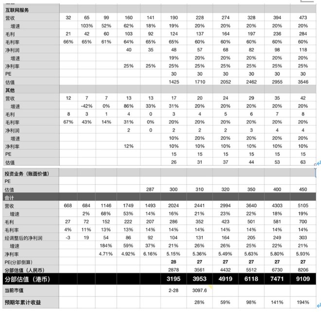 1)预计公司2022年的净利润为205亿元人民币,每年保持25%以上的增速,给与25-30倍的PE,则3年后的市值在5680-6815亿港币,累计回报率在83.36%—120%。