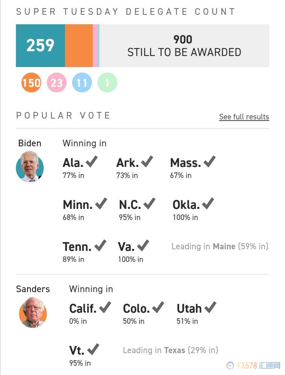 根据Politico的实时数据显示,拜登14个州中在8个州中占据优势,而桑德斯仅在4个州领先。同时1375张选票中,拜登获得了259票,而桑德斯仅有150票,第三位的布隆伯格仅有23票。