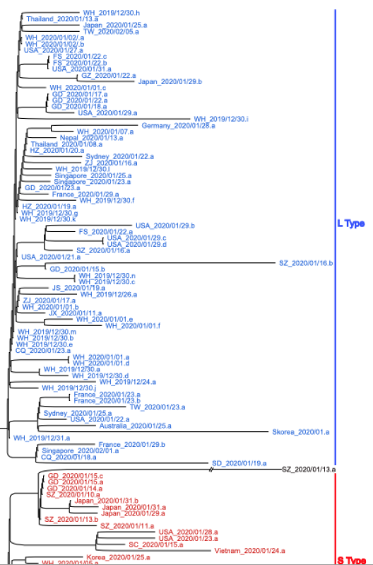 论文通过对目前为止最大规模的103个新冠病毒全基因组分子进化分析,发现病毒株已发生了149个突变点,而且多数是近期产生的。该研究揭示:新冠病毒已经演化出L和S两个亚型。其中101个属于这两个亚型。从占比上看,L亚型更为普遍达到70%,S亚型占30%。