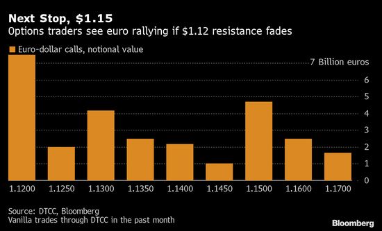 欧元已经在过去两周上涨超过3.5%,期权市场预示还有望进一步上涨3%。美国存管信托与结算公司上月数据显示,对欧元兑美元升至1.15美元的看涨兴趣浓厚,这是2019年1月以来最高水平。