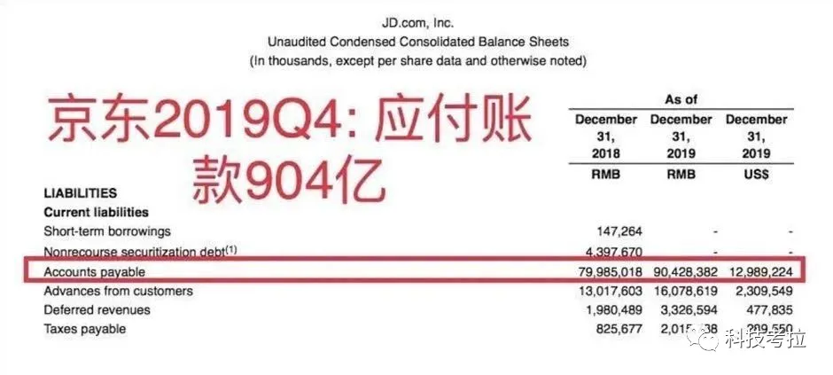 接着看财报。截止2019年12月31日,京东账上的现金及现金等价物、受限资金及短期投资为645亿元。这个数字,显然低于四季度904亿元的应付账款总额。此时,就需要通过账期来缓解资金压力。