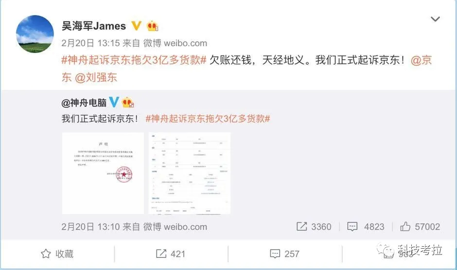 2月20日,神舟电脑董事长吴海军在微博上发布声明,宣布将起诉京东拖欠3亿多元货款。
