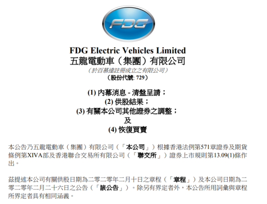 3月4日晚间消息,五龙电动车(00729.HK)公布,于2020年3月2日,公司收到代表金港集团投资有限公司(“呈请人”,于紧接供股完成前为持有公司约12.22%已发行股本的主要股东)的法律顾问的函件,当中附有针对公司据称已提交百慕达最高法院(“法院”),并无任何案件编号的未盖章呈请文本,以公正及公平之理由要求法院下令公司清盘。